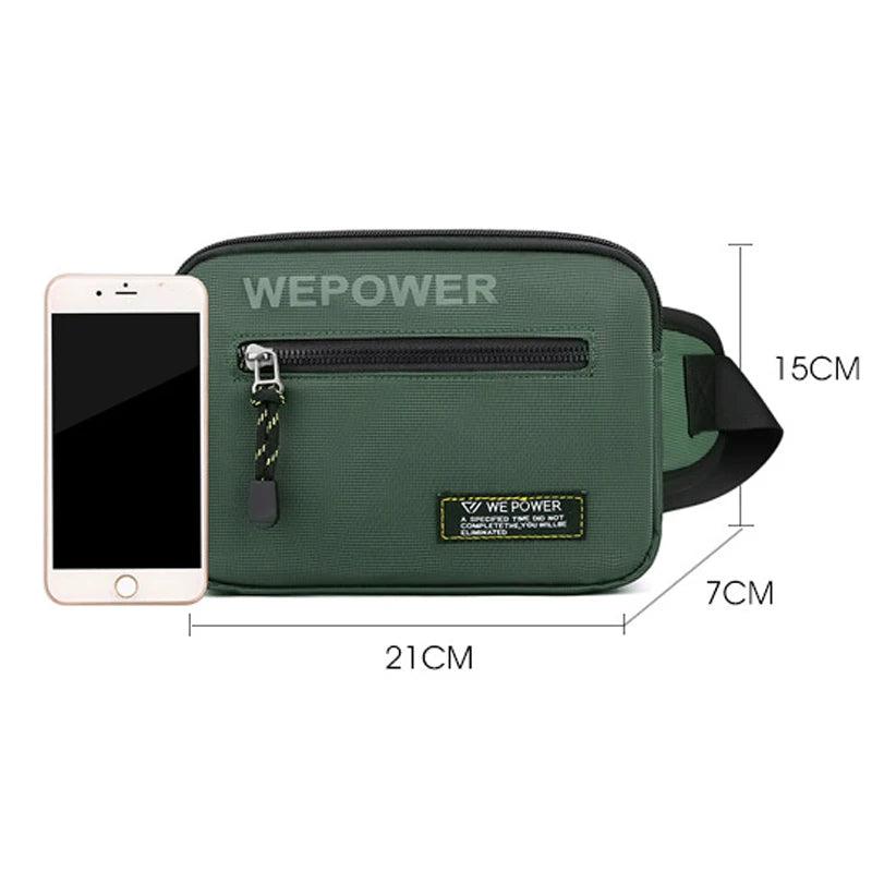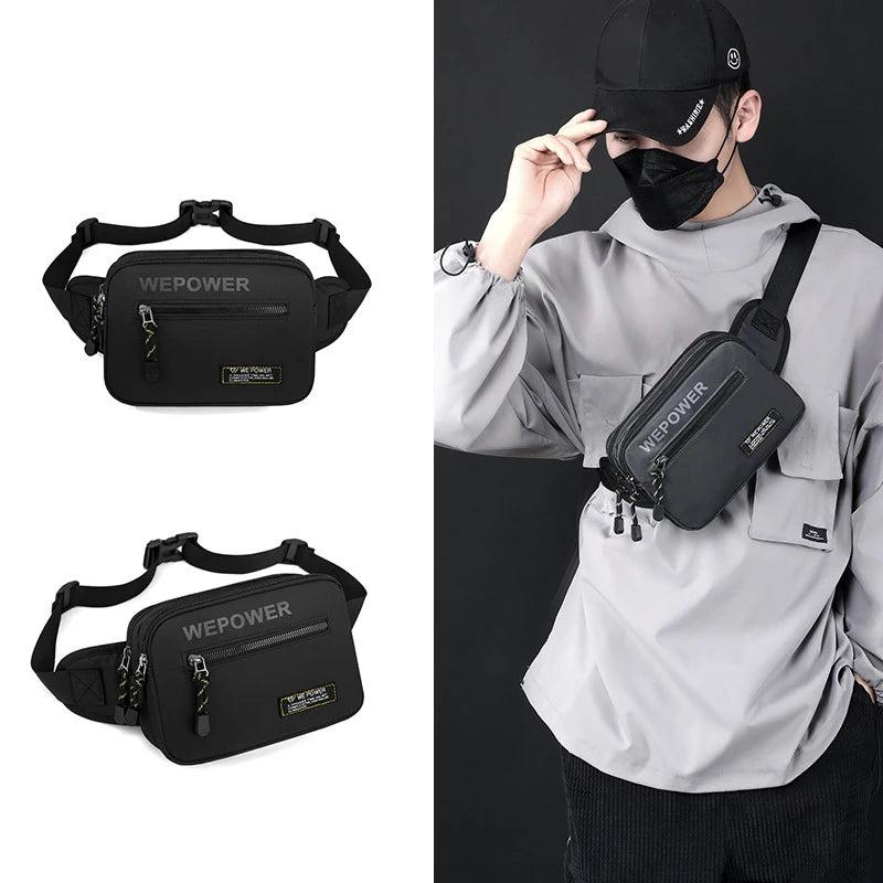 This versatile waist bag is perfect for outdoor activities, made of waterproof nylon material. It features multiple layers for organizing your belongings, including a phone pouch. Can be worn as a chest pack or crossbody messenger bag.