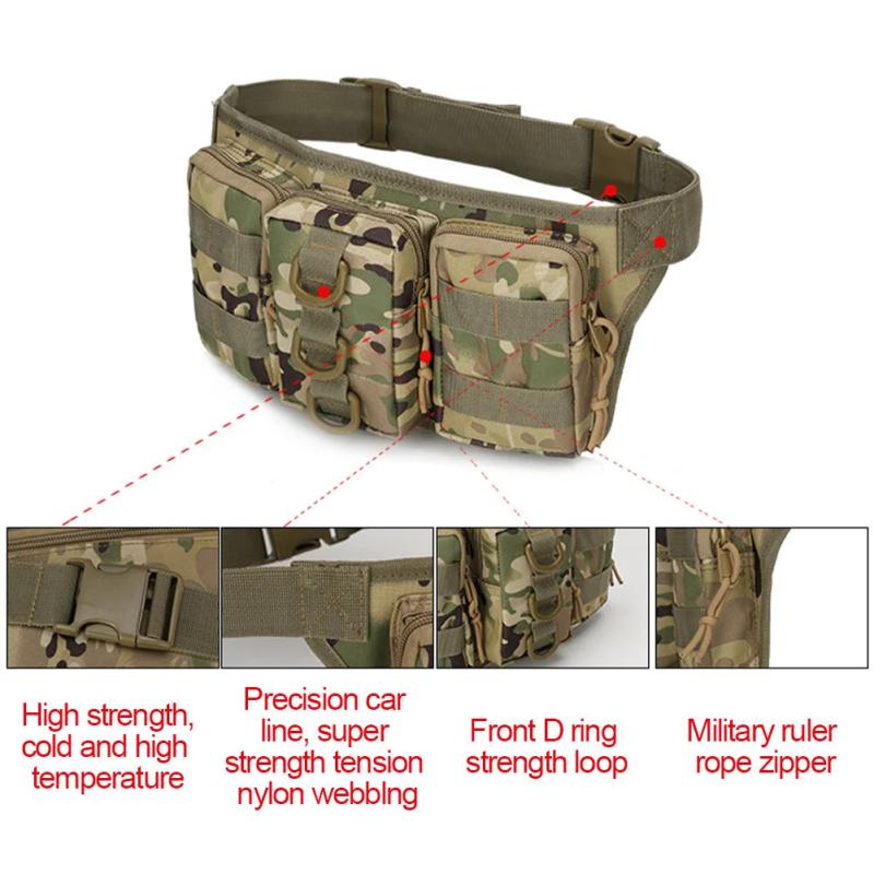 This waist bag is perfect for outdoor activities like hiking, climbing, camping, and more. It is designed for army fans and has a rugged, military-inspired look.