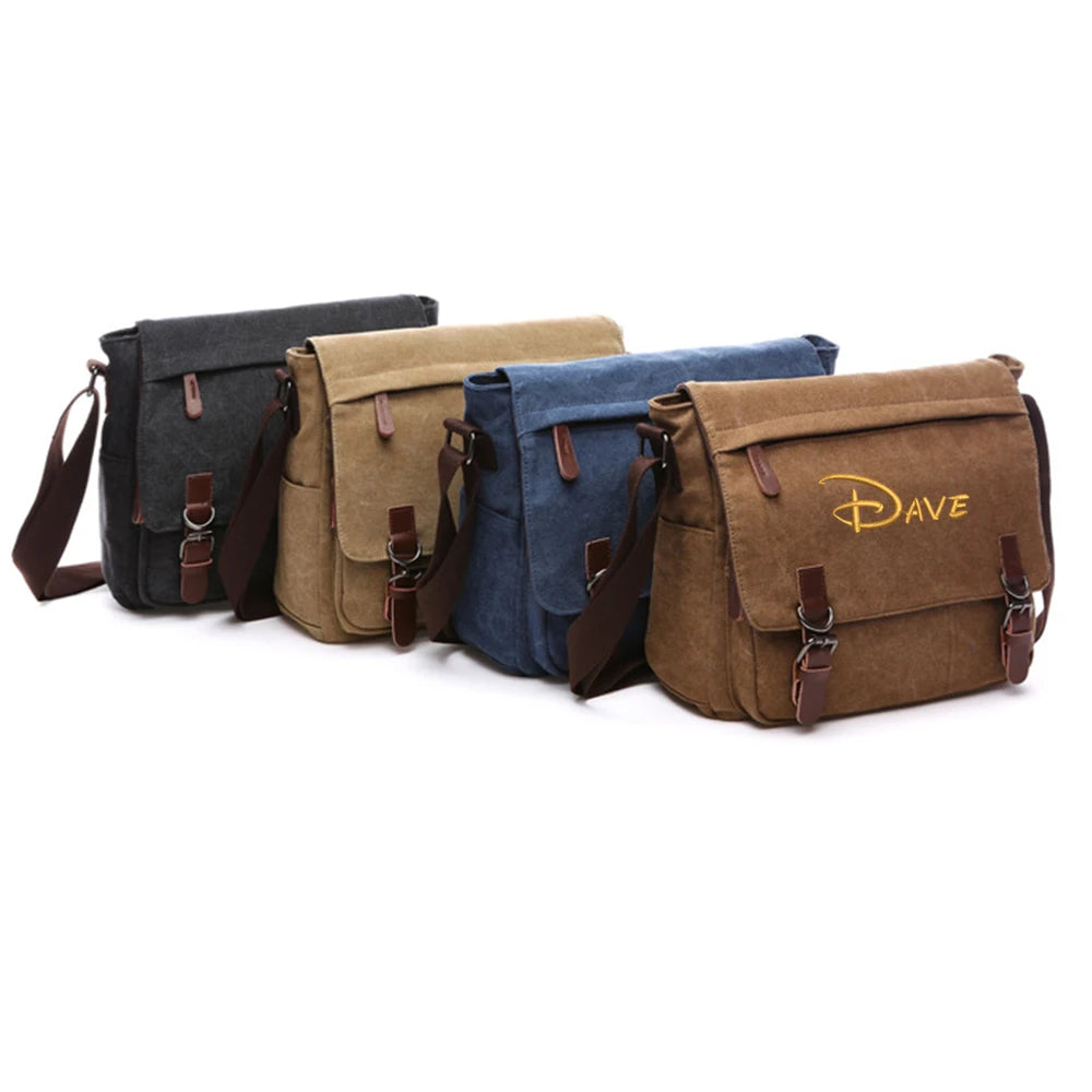 Get this stylish messenger bag with your name elegantly embroidered. Perfect for students and professionals. This canvas mailman bag can carry your laptop and essentials.