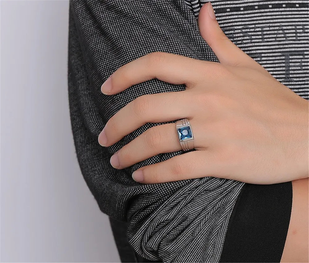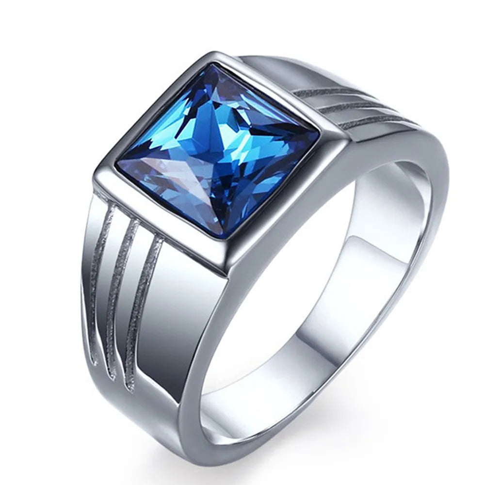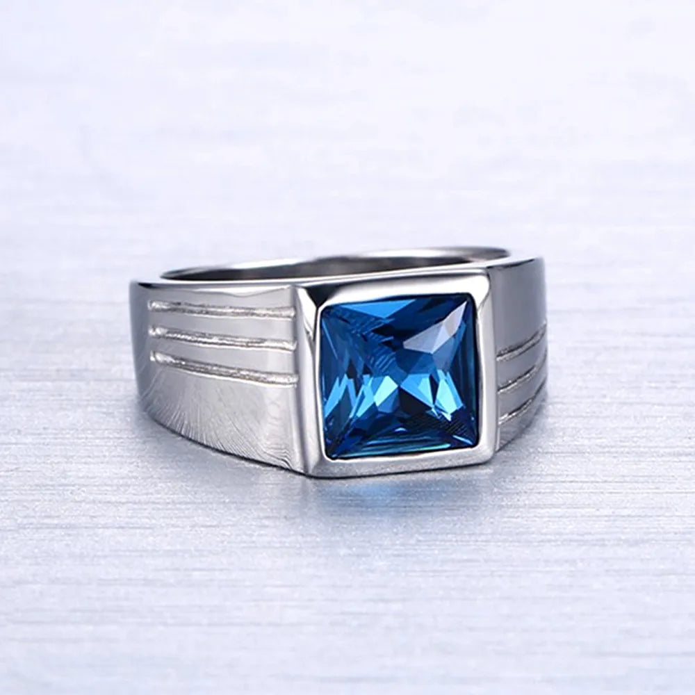 Square Aquamarine Gemstone Men's Ring Stainless Steel Diamond Jewelry