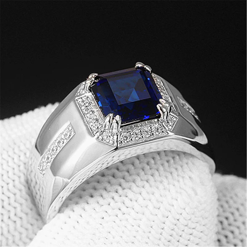 Square Crystal Sapphire Diamond Men's Silver Ring