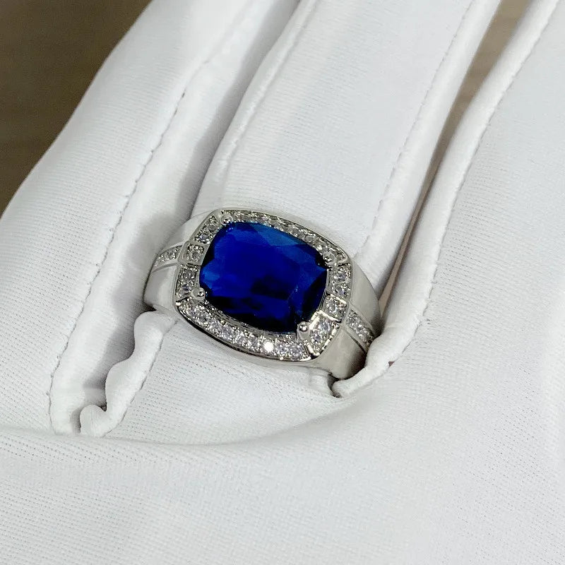 Square Zircon Sapphire Diamond Men's Silver Ring Accessory