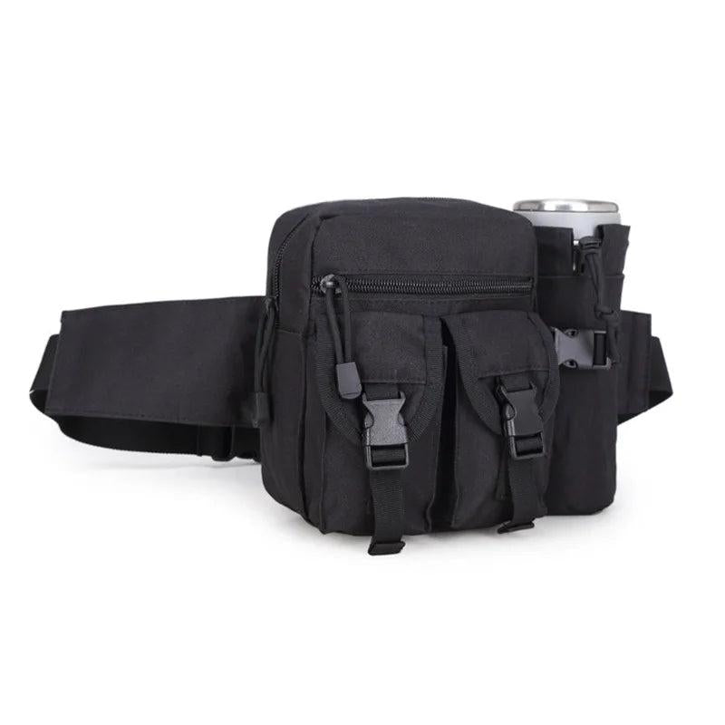 This tactical waist bag is designed for outdoor activities like hiking, fishing, and sports. It features a water bottle holder and multiple pockets for convenient storage.