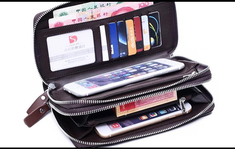 - Features multiple compartments for cash, coins, cards, and a mobile phone