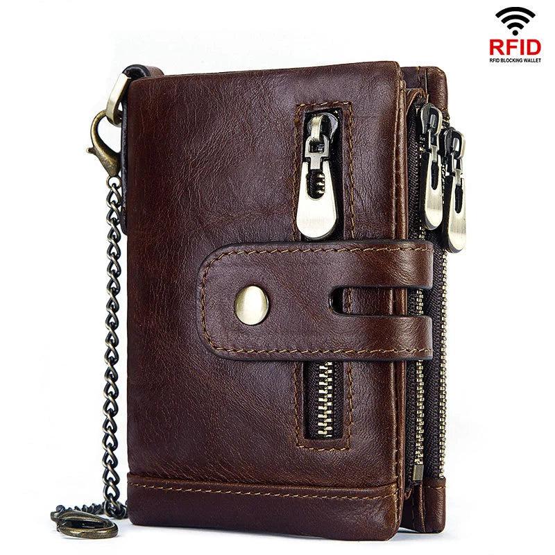 Protect your money and cards with this high-quality cowhide leather wallet featuring RFID blocking technology and a durable iron chain.