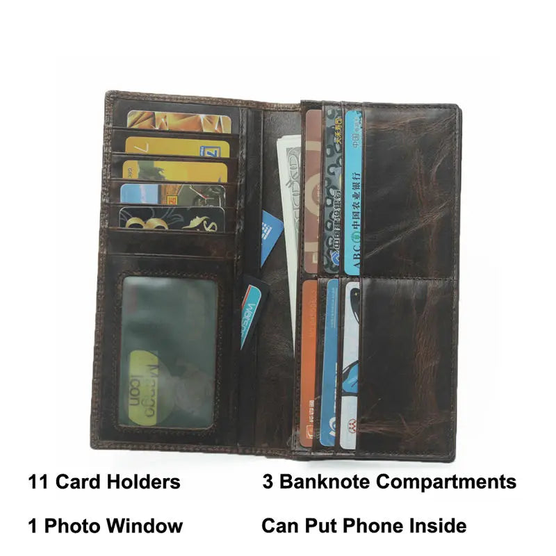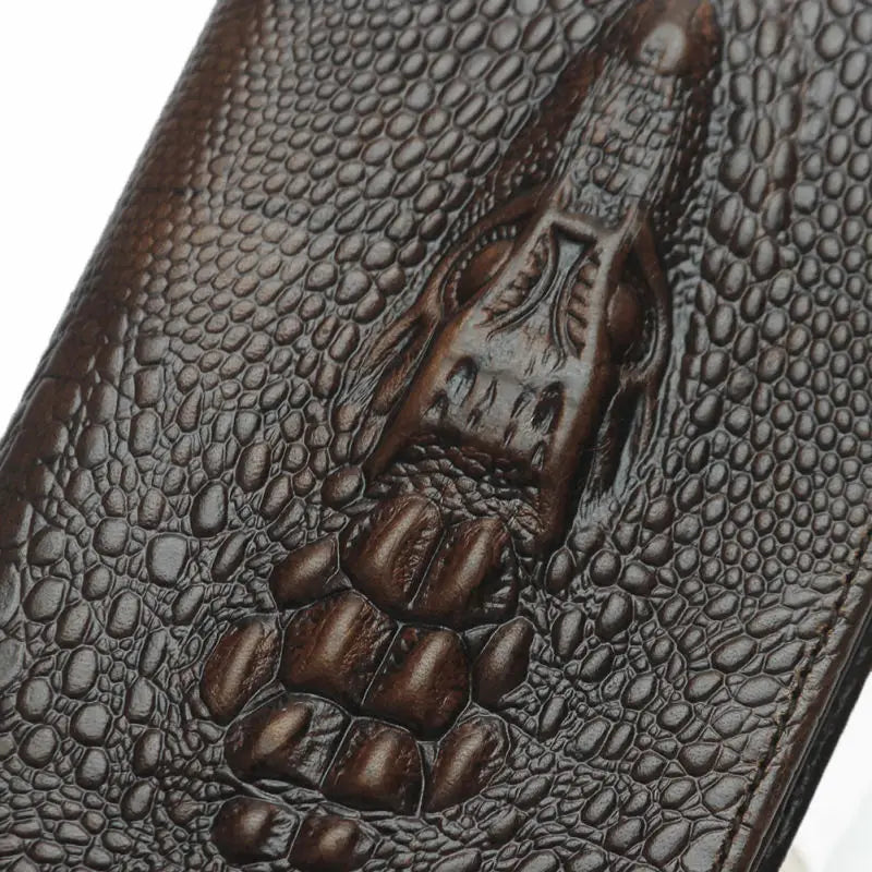 This crocodile leather wallet is made of 100% cowhide and features a long design that can hold your money, phone, and other essentials. Perfect for men, it is a stylish and practical accessory.