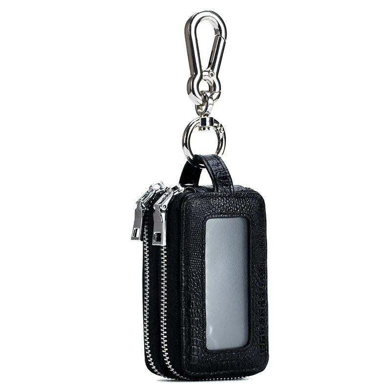 This men's leather waist hanging wallet features a crocodile pattern and offers big capacity with double zippers and multiple layers for storing keys, cards, and cash.