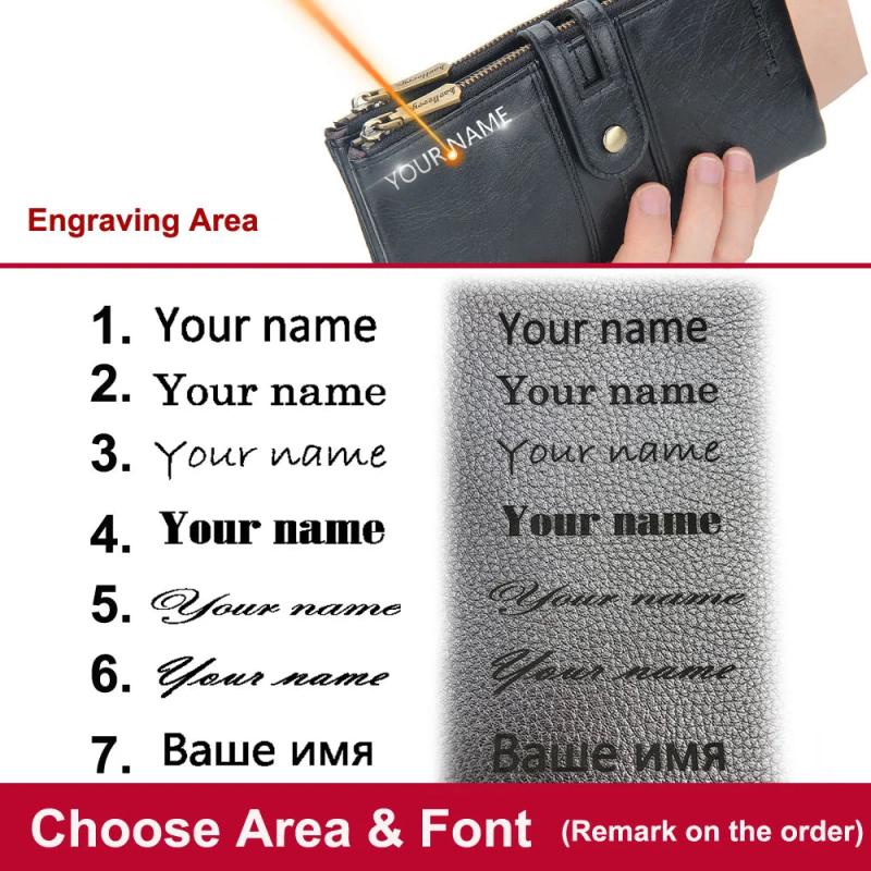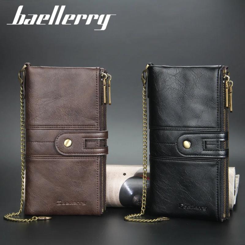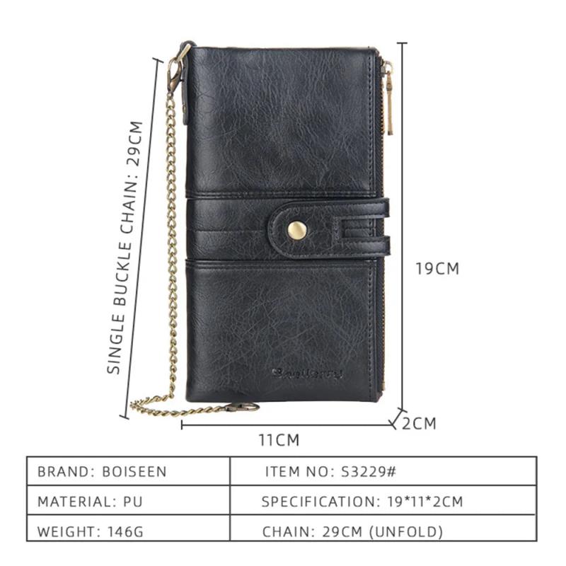 Stylish men's wallet with a phone holder and chain, crafted from durable PU leather. Features double zipper pockets and name engraving for a personal touch.