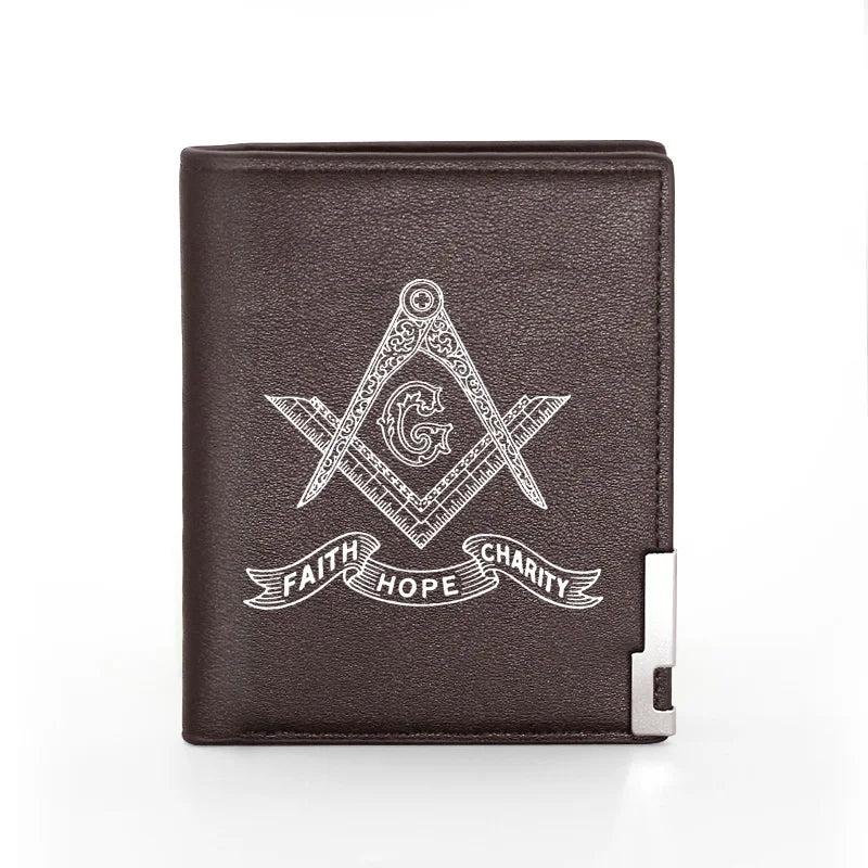 This men's wallet features a Freemason printing design and is made of high-quality leather. It includes a billfold, credit card slots, ID holders, and a money bag, making it convenient and stylish for everyday use.