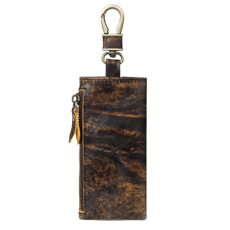 Keep your keys organized and secure with this stylish leather key wallet. Perfect for men on the go, this key holder features a zipper closure and can hold various keys.