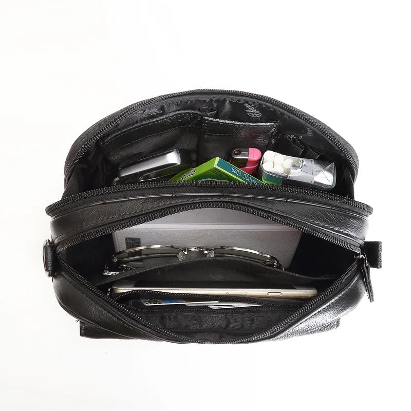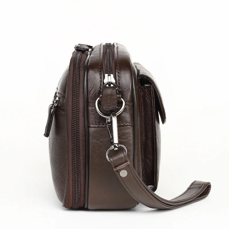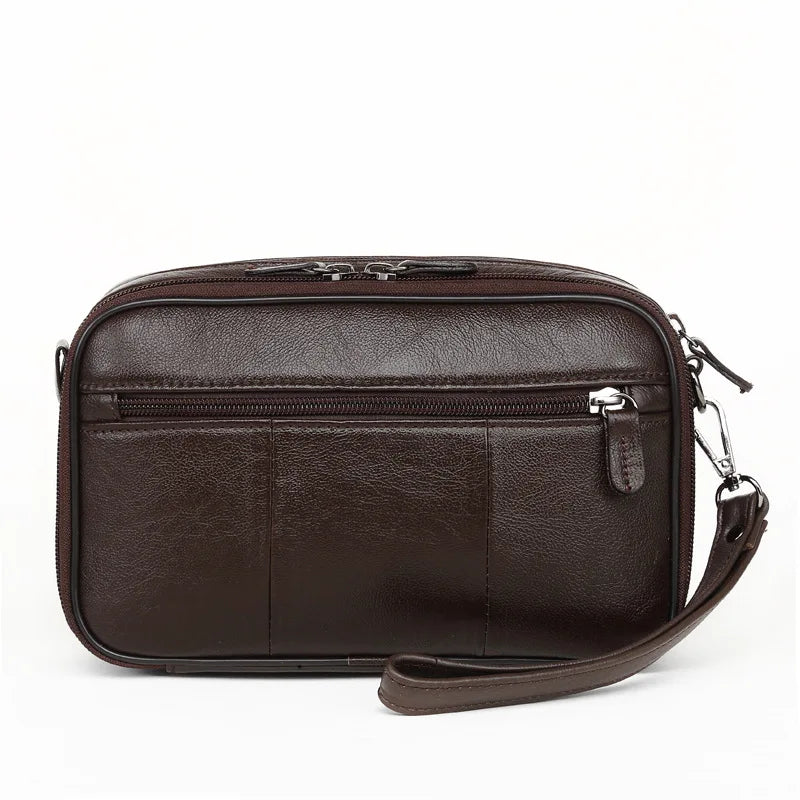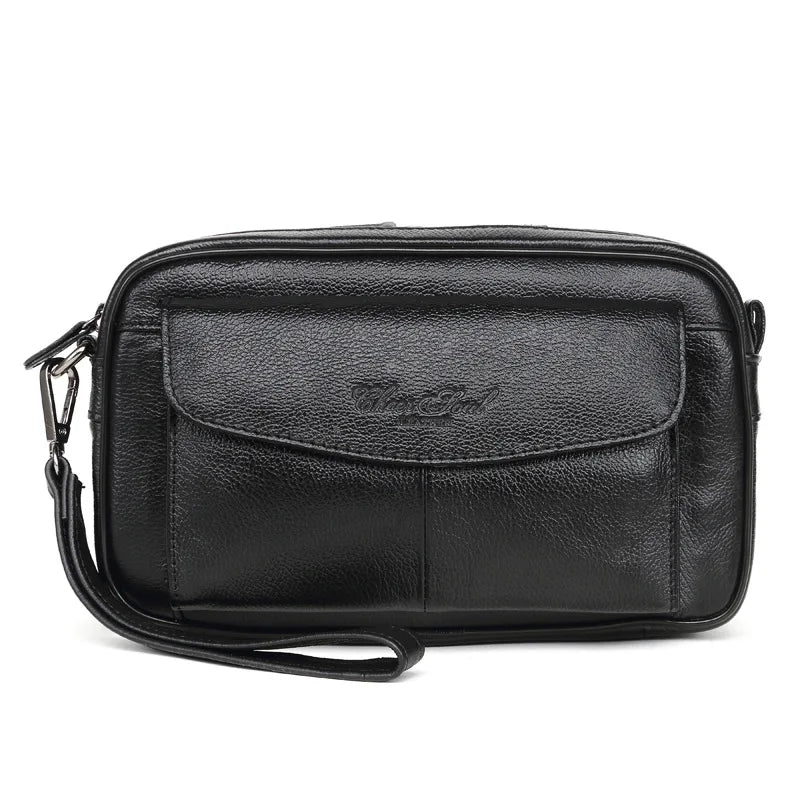 This men's business clutch bag is made of high-quality cowhide leather, featuring a long zipper closure. It serves as a wallet, purse, money bag, and mobile phone case, providing ample storage and organization.