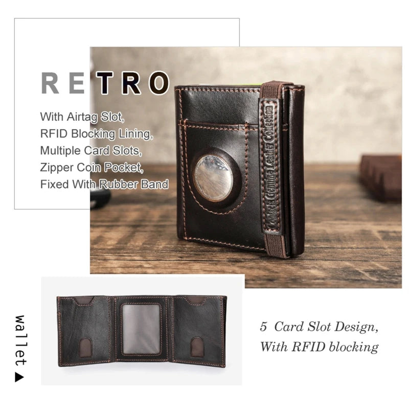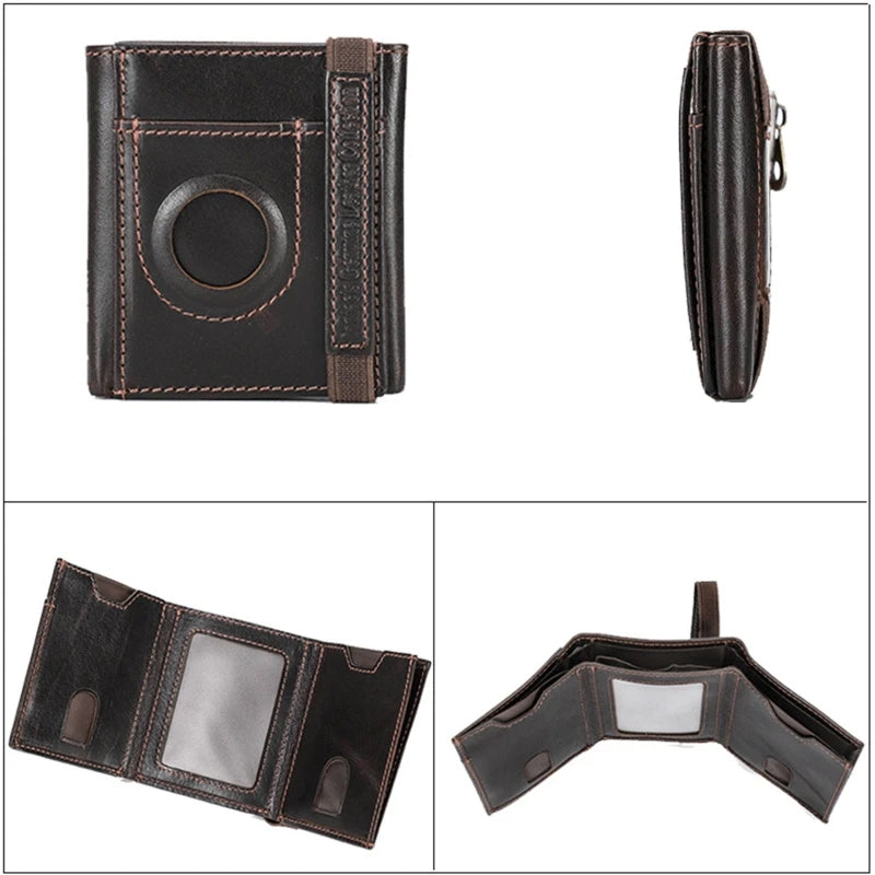 This men's slim trifold wallet is made of genuine leather and features RFID protection. It is compatible with Airtag for tracking purposes.