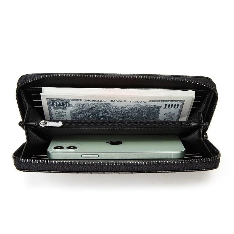 This men's long wallet is made of high-quality leather with striped embroidery and woven design, perfect for business use. It is ultra-thin and spacious enough to hold all your essentials.