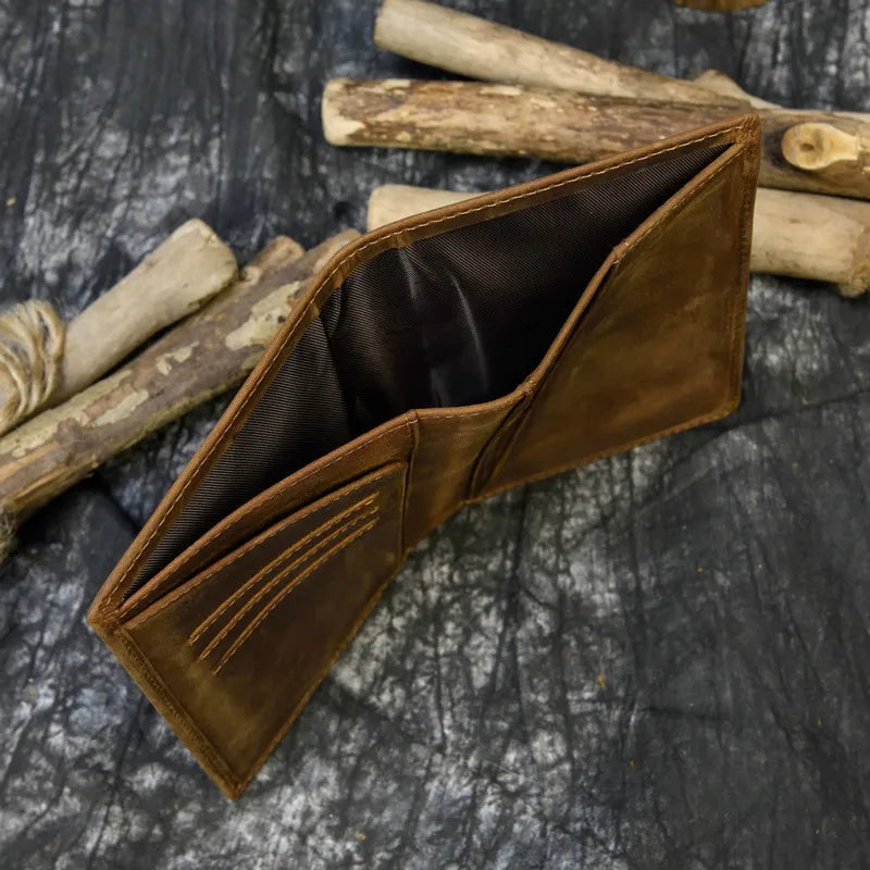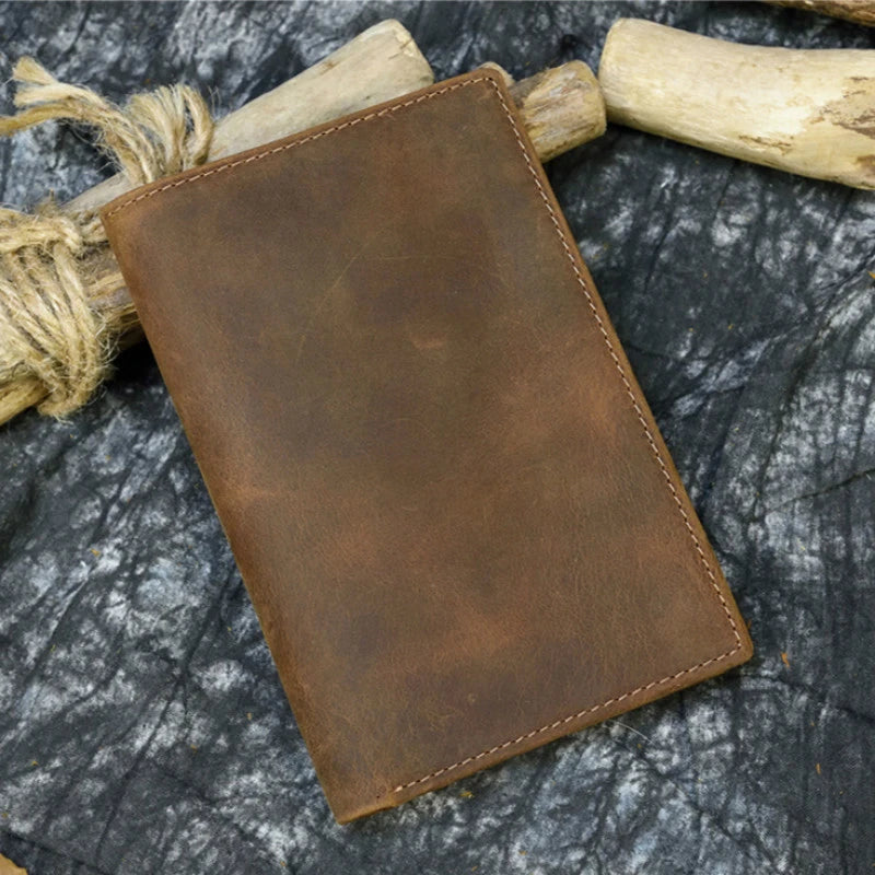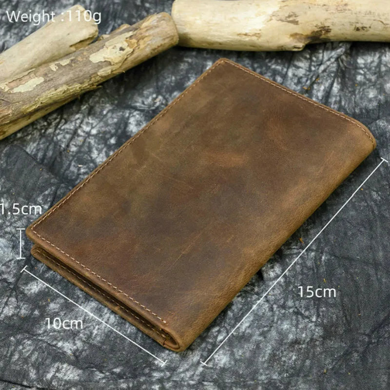 This leather wallet is designed for men with a crazy horse leather finish, large capacity, and multi-functionality. It is perfect for holding passports and other essentials.