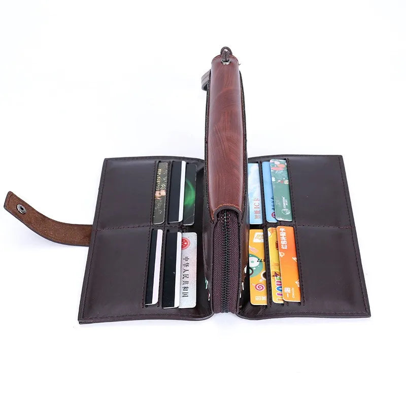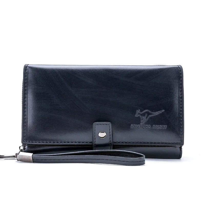 This men's clutch bag is crafted from oil wax leather, featuring a long zipper closure for secure storage. It includes a coin purse and phone pocket for added convenience.