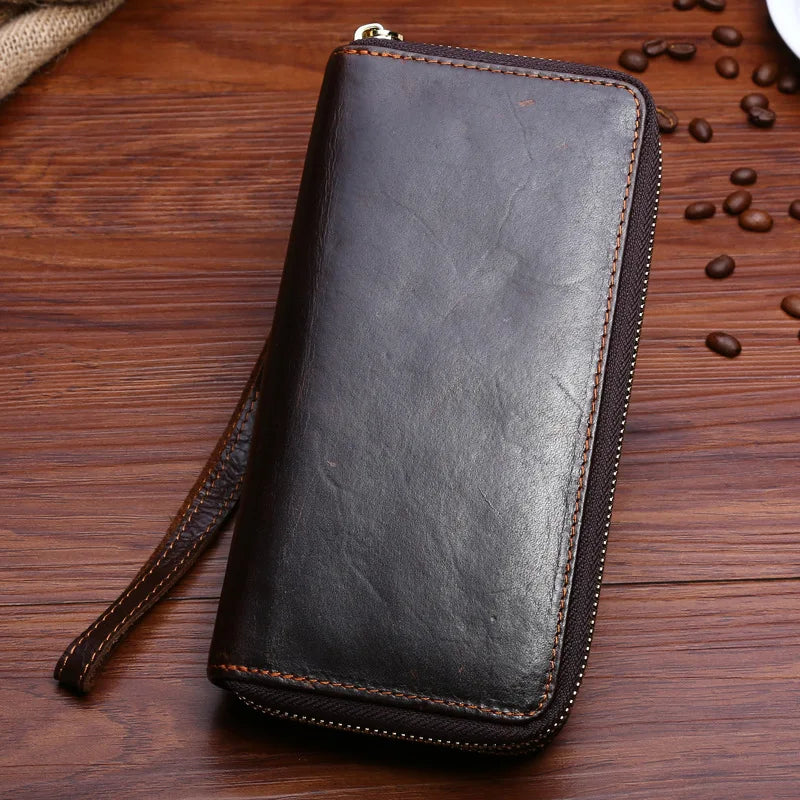 Men Wallet Retro Purse Leather Double Zipper Business Clutch Bag