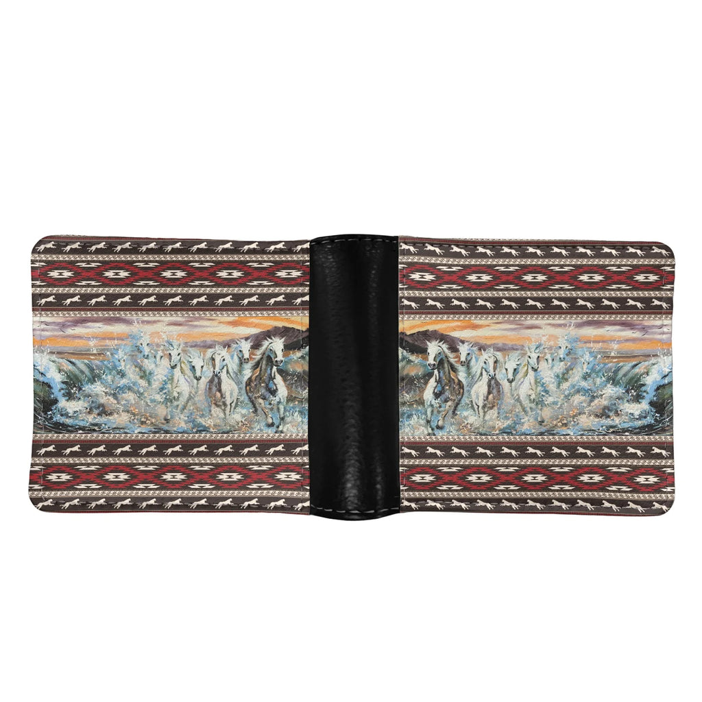 This men's wallet features a unique tribal style horses print design. It is made of high-quality leather and includes a coins pocket. The wallet is thin and foldable, making it convenient for everyday use.