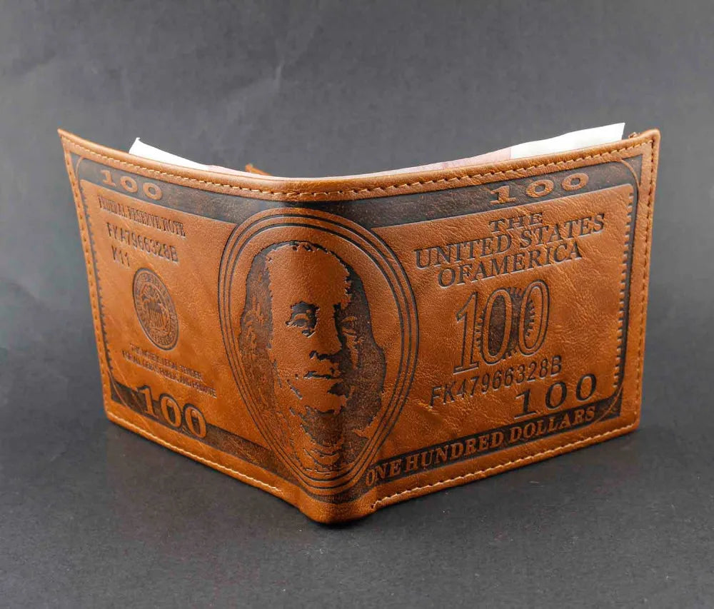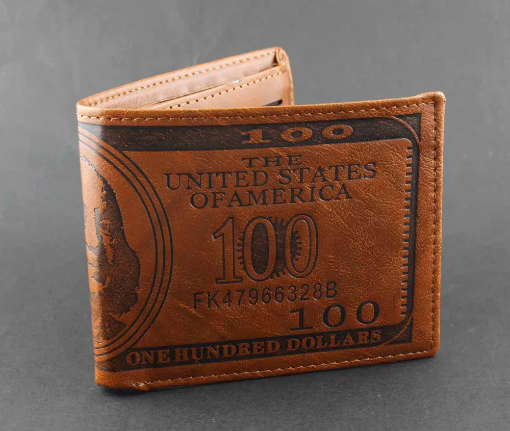 This men's wallet features a unique design with a 100 dollars bill pattern. It is made of high-quality leather and has multiple slots for cards and cash.
