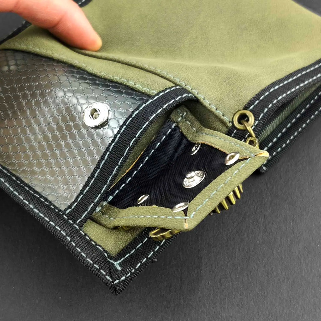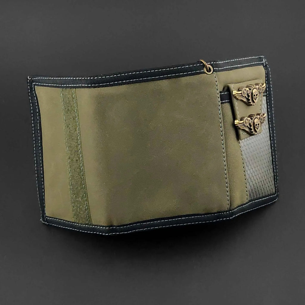 Stay stylish with this biker-inspired double wing skull clutch wallet in army green, featuring a chain for added security and convenience.