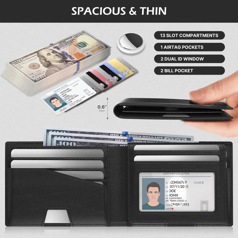 This high-quality leather wallet is made from cowhide with a short bifold design. It offers a large capacity to hold your cards and cash securely. Comes with an Airtag holder for added convenience.