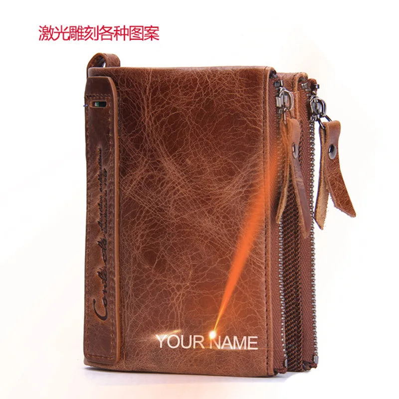 Stay organized with this elegant short zero purse made of crazy horse leather. Features double zippers for extra security.