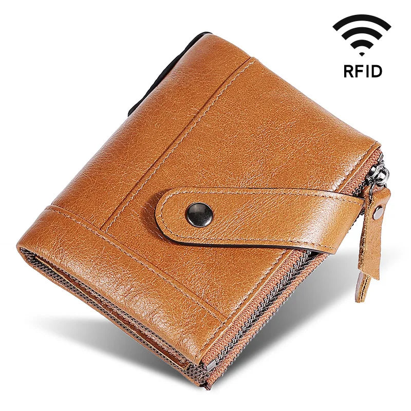 This men's wallet features a double zipper design, a buckle for added security, and is made of high-quality oil wax leather. The wallet is antimagnetic and includes a convenient coin pocket.