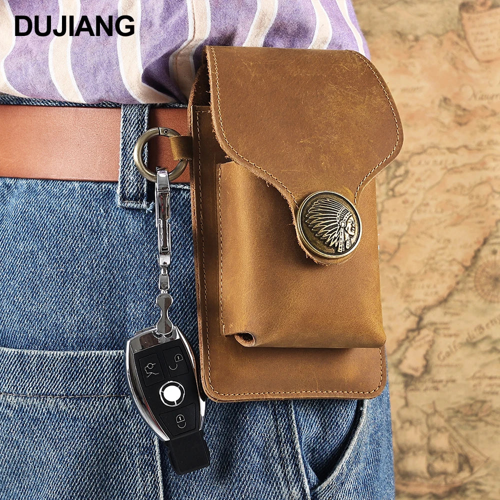 This waist bag is made from high-quality crazy horse cowhide leather, featuring a cash slot, mobile phone pouch, and retro wallet design with a belt loop hoop.