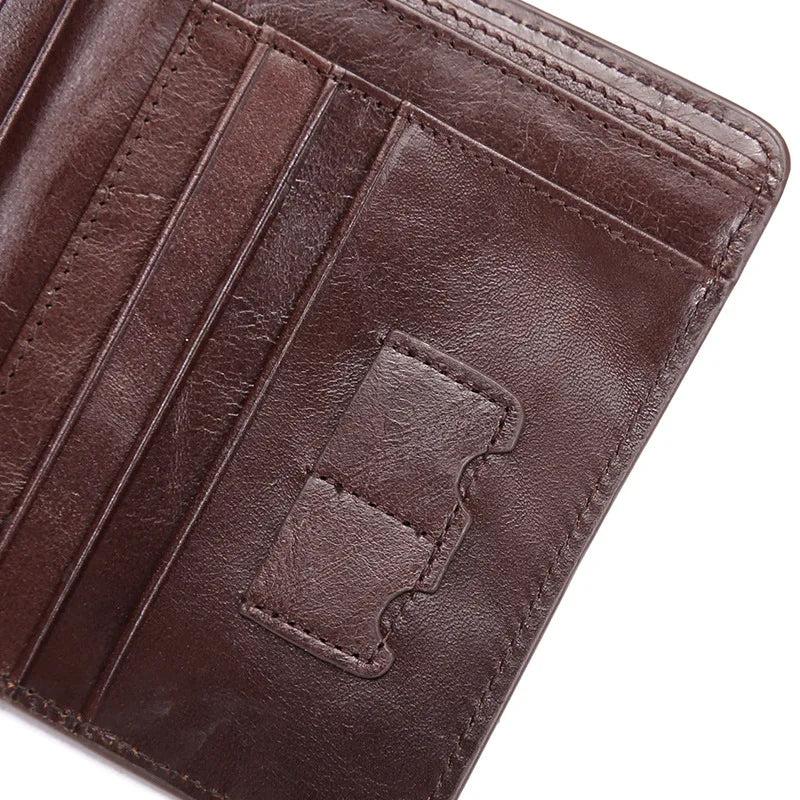 This men's casual wallet is made of premium first layer cowhide leather, offering a soft and retro look. It is designed to be thin and compact, perfect for everyday use.