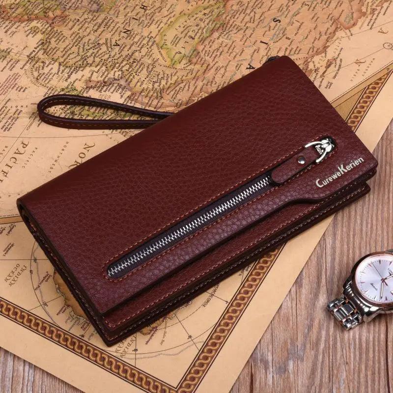 Stay organized in style with this men's long wallet made of high-quality PU leather. Features a hand zipper for secure closure and easy access. Perfect for business use or everyday convenience.