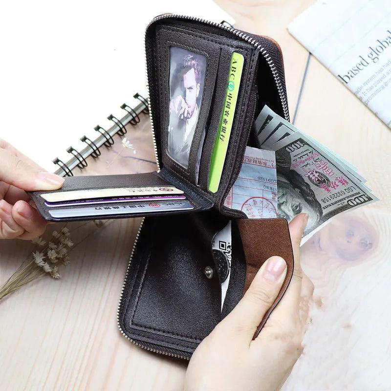 This men's short wallet features a classic design with a large capacity, zipper closure, and multiple card slots. It is perfect for business use.