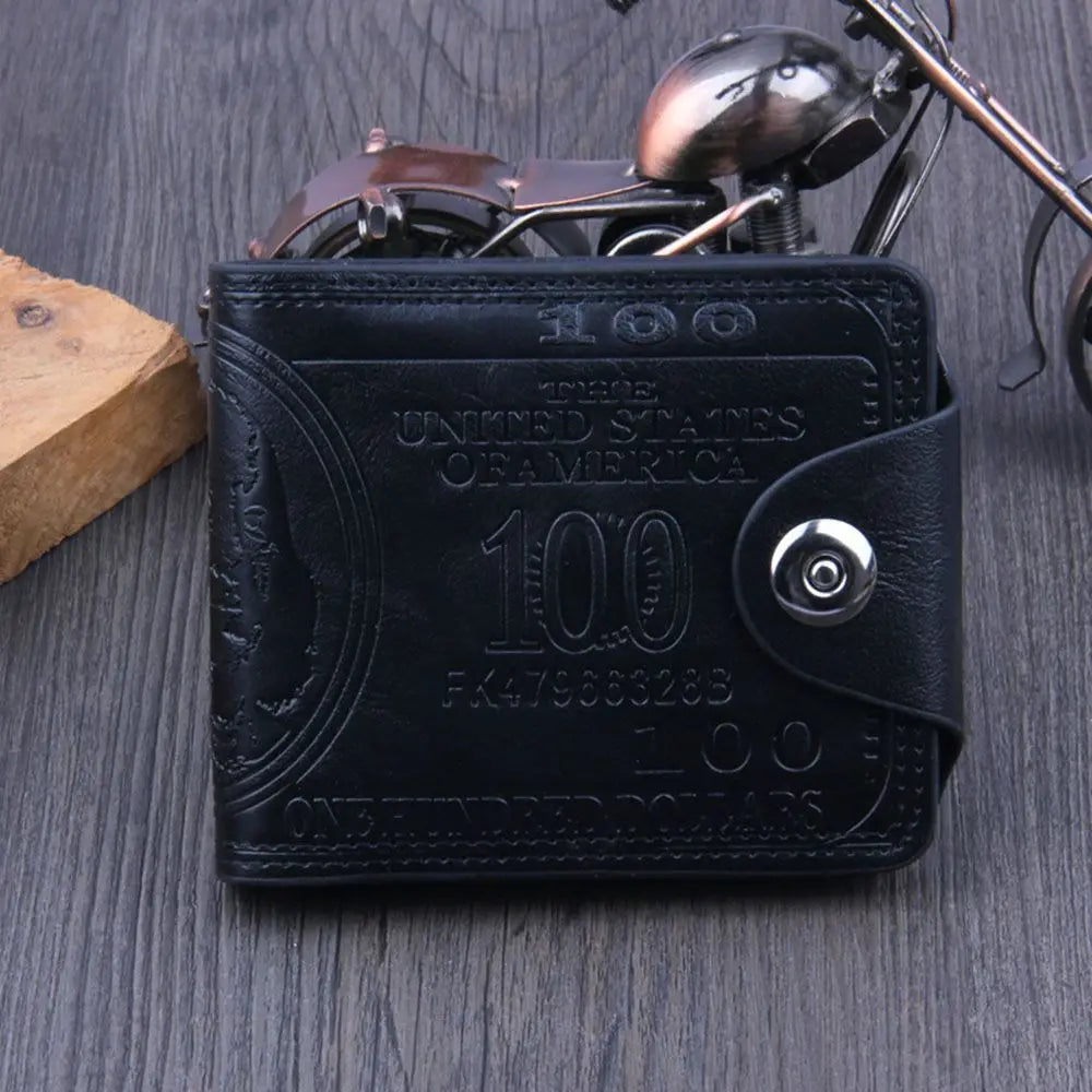 This men's short wallet features a pressure change magnetic buckle and is made of high-quality PU leather. It has a unique design with double line stitching and can hold hundred dollar bills.