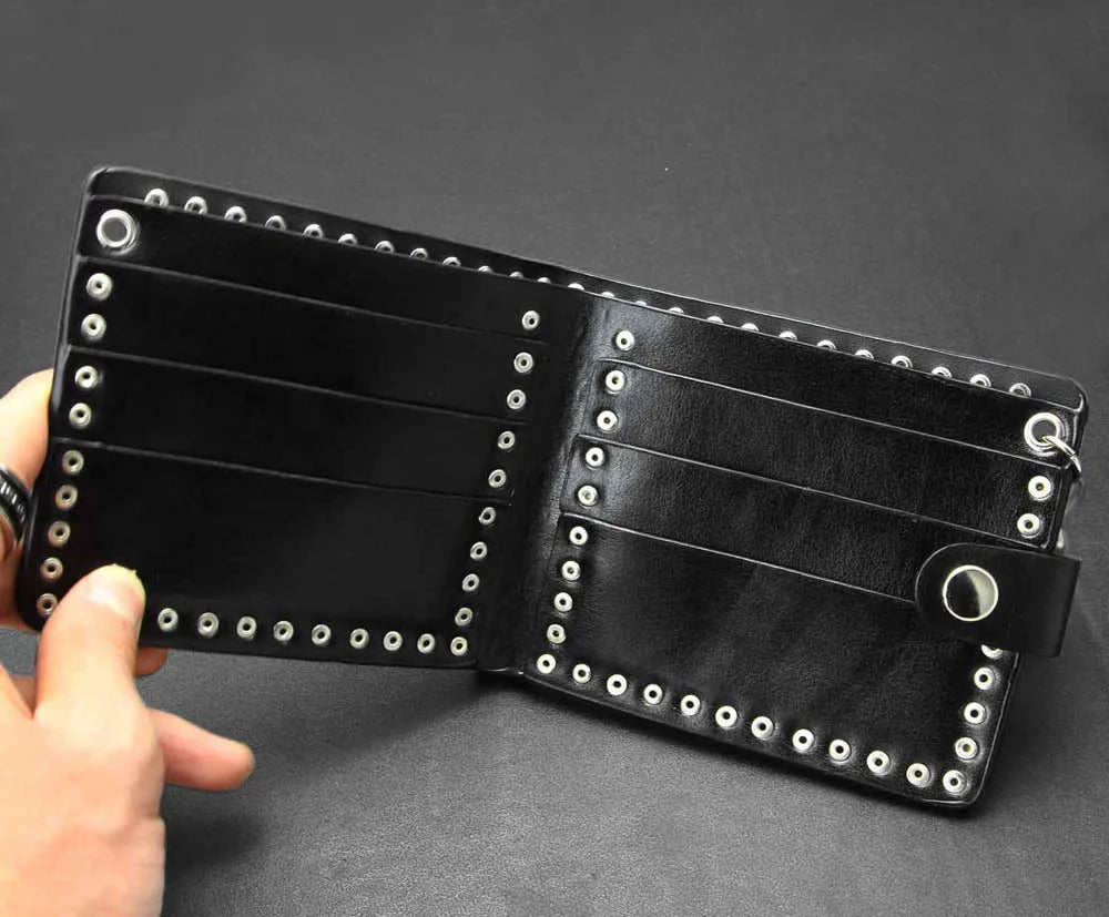 Stay edgy with this men's leather wallet featuring skull studs and a long jeans key chain. Perfect for adding an alternative twist to your accessories collection.