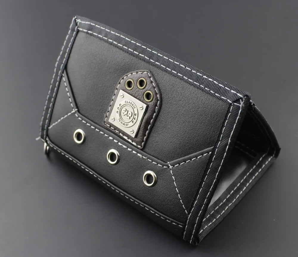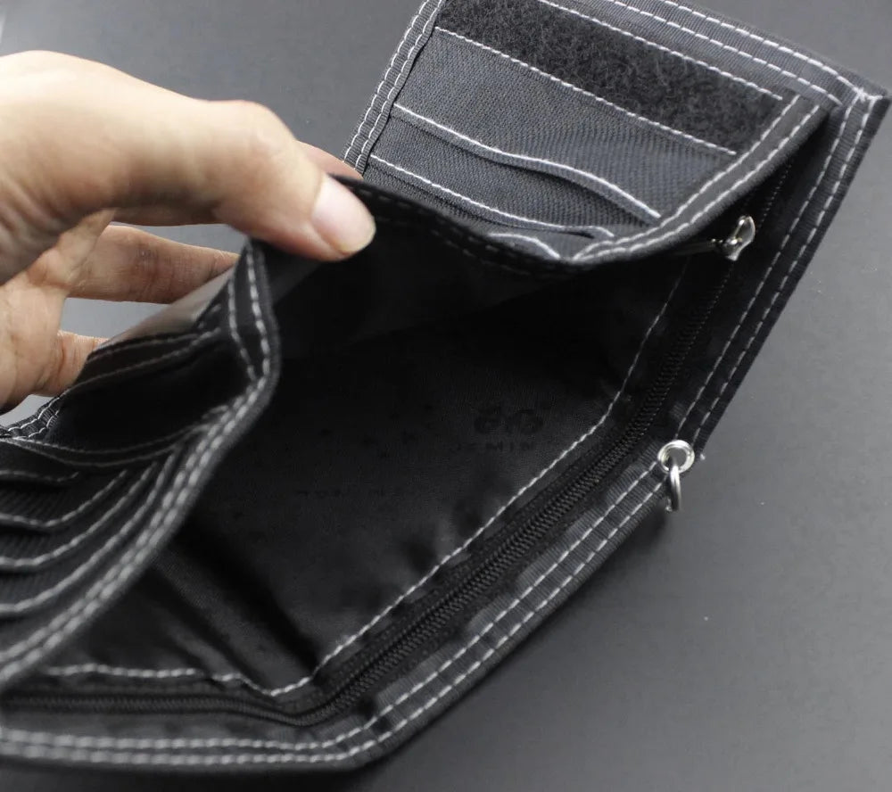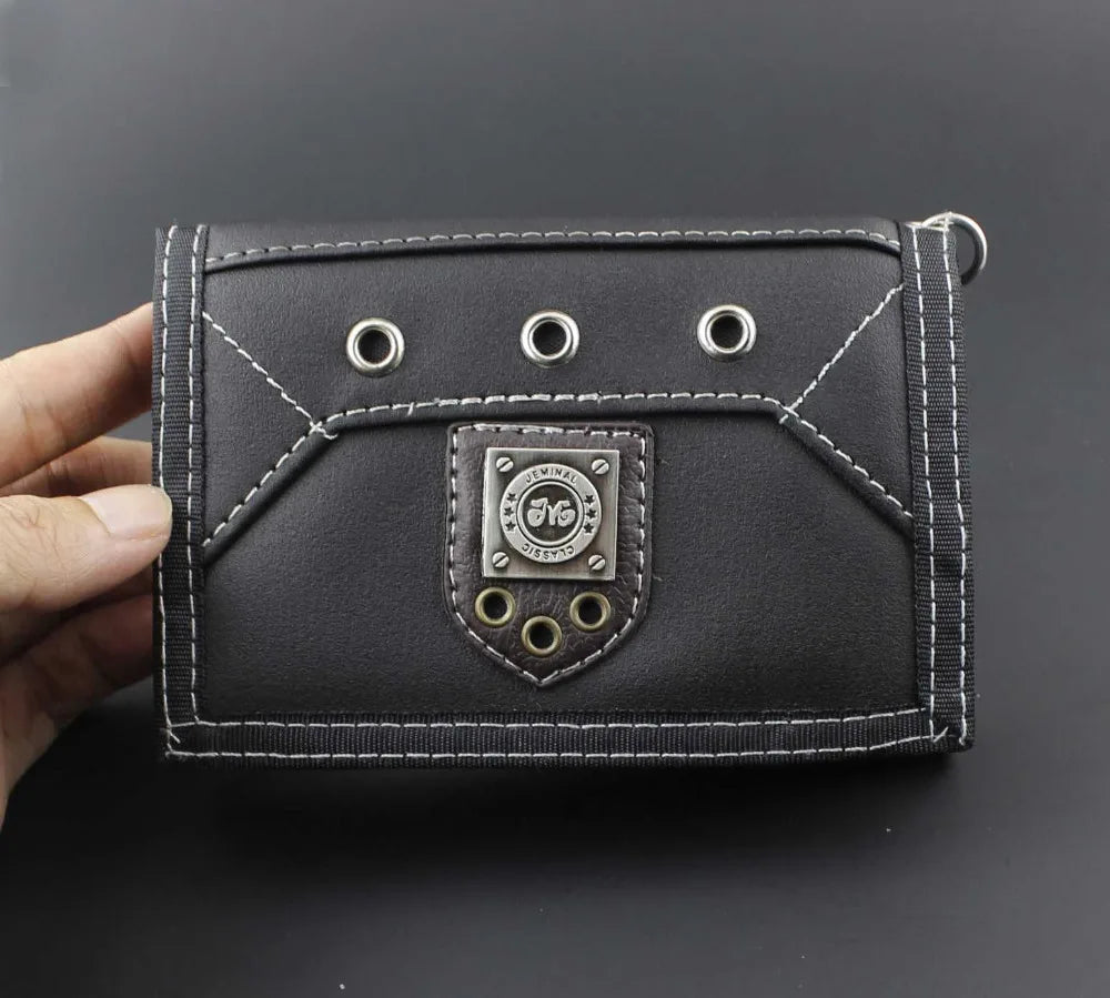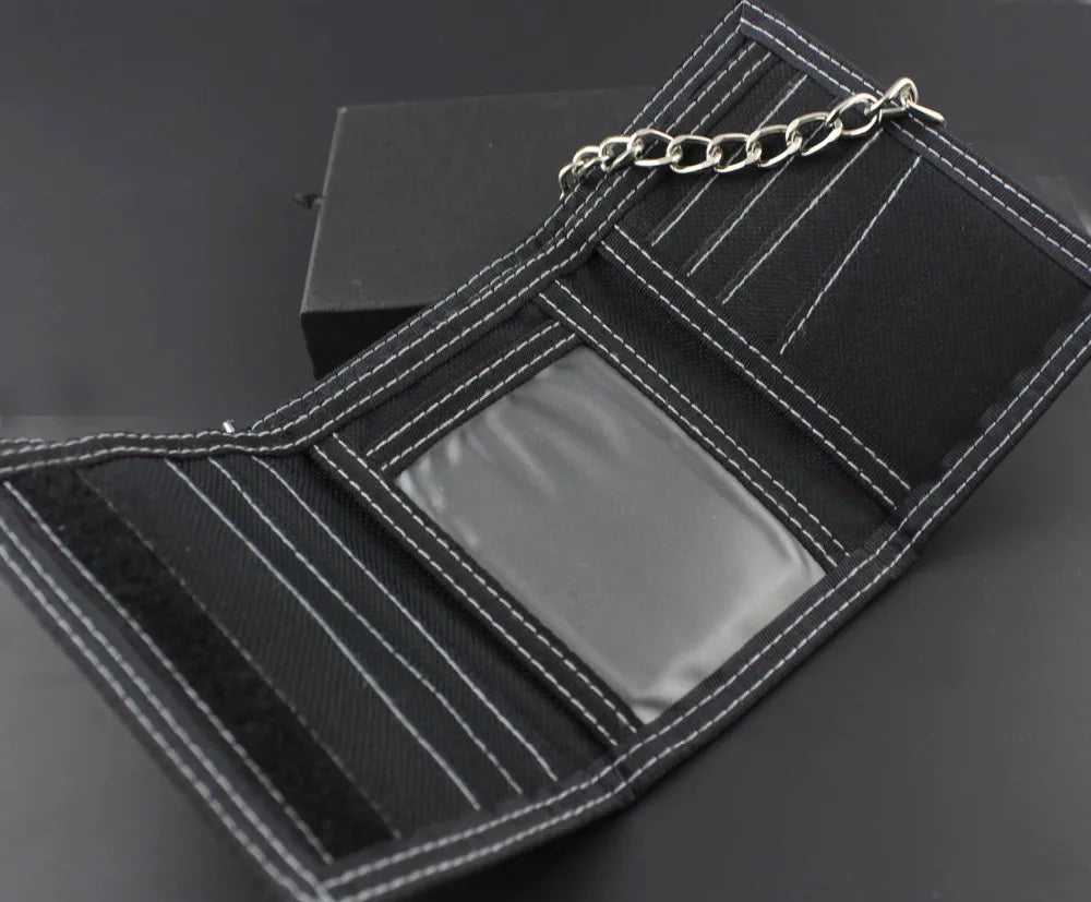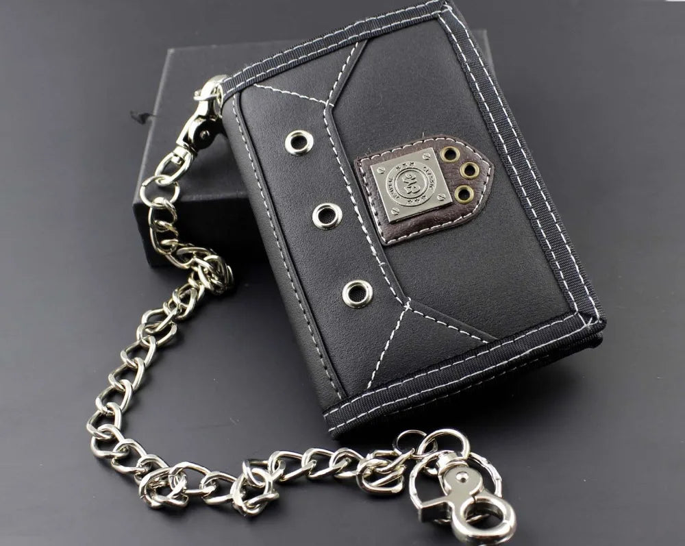 Stay stylish and organized with this biker style canvas trifold leather wallet. It features a chain for security. Ideal for men and teens.