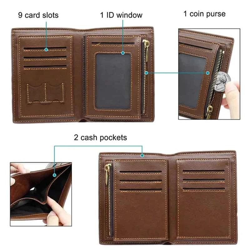 Elegant tri-fold PU leather purse for men with name corner monogram design. Perfect for personalization and engraving. Ideal as a gift or for everyday use.