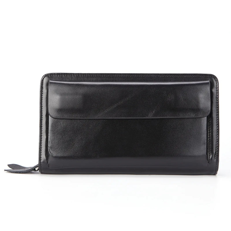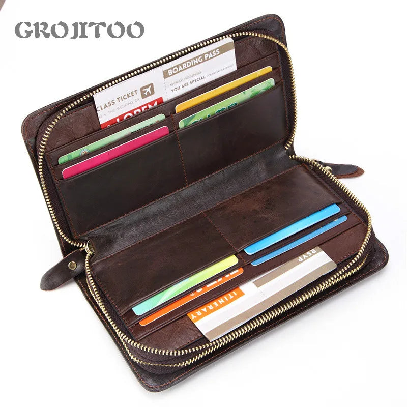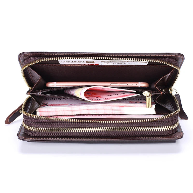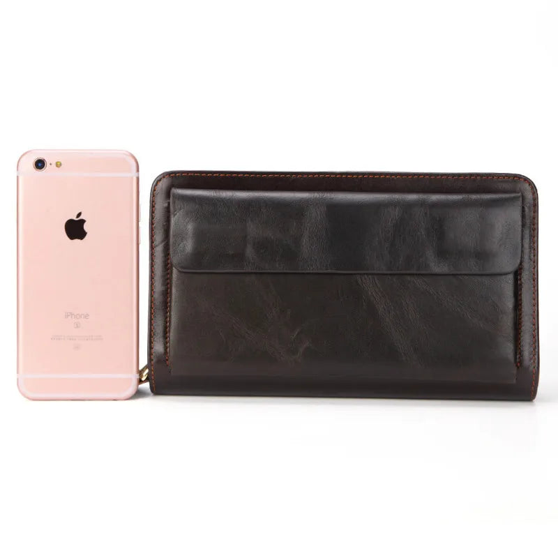 This long men's wallet is made from high-quality oil wax leather. It features a double zipper design and multiple pockets for cards, coins, and cash. The perfect accessory for any man on the go.