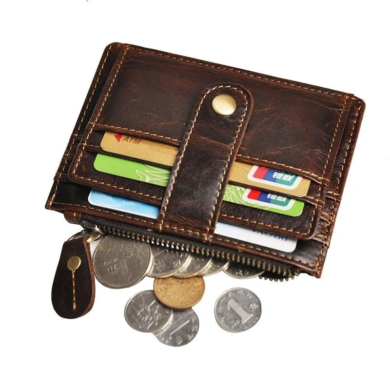 Stay organized with this stylish men's wallet made from first layer oil wax leather. It features multiple card slots, a button closure, and a coin pocket.