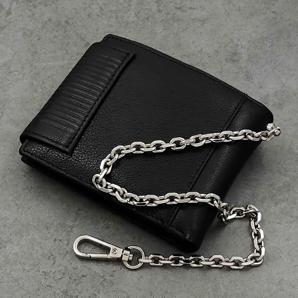 Get a edgy style with this punk biker skull men's leather wallet. It features a chain for security and convenience.