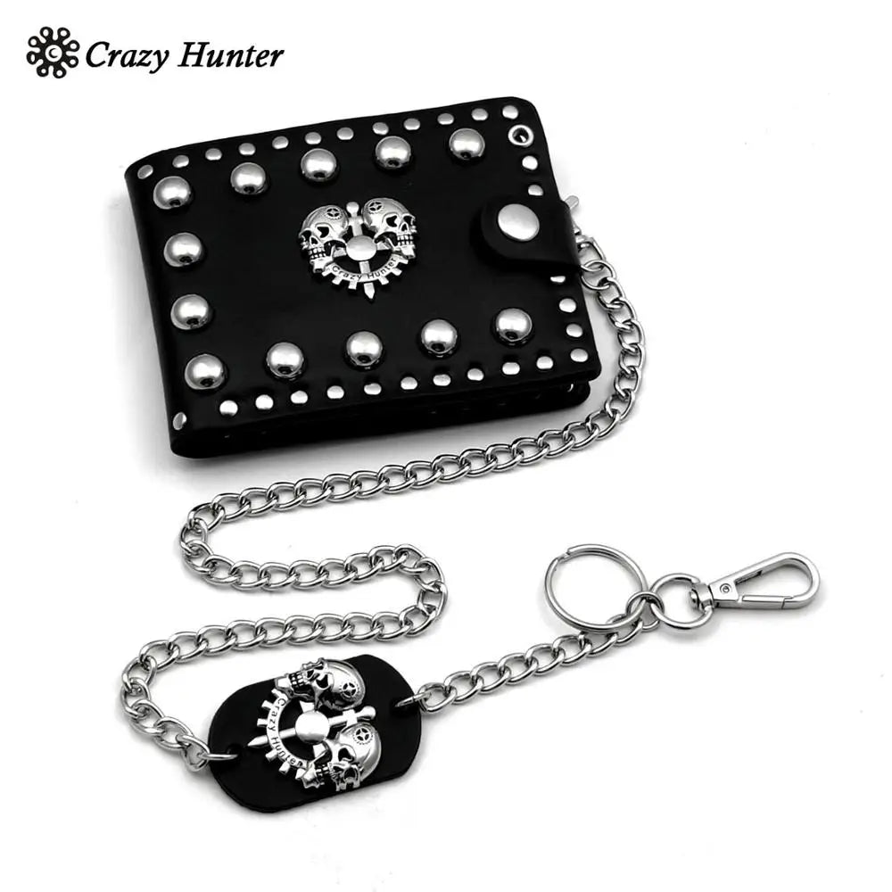 This stylish leather wallet features a studded skull design, ideal for bikers and punk enthusiasts. It includes an ID card and money clip with a chain for added security.