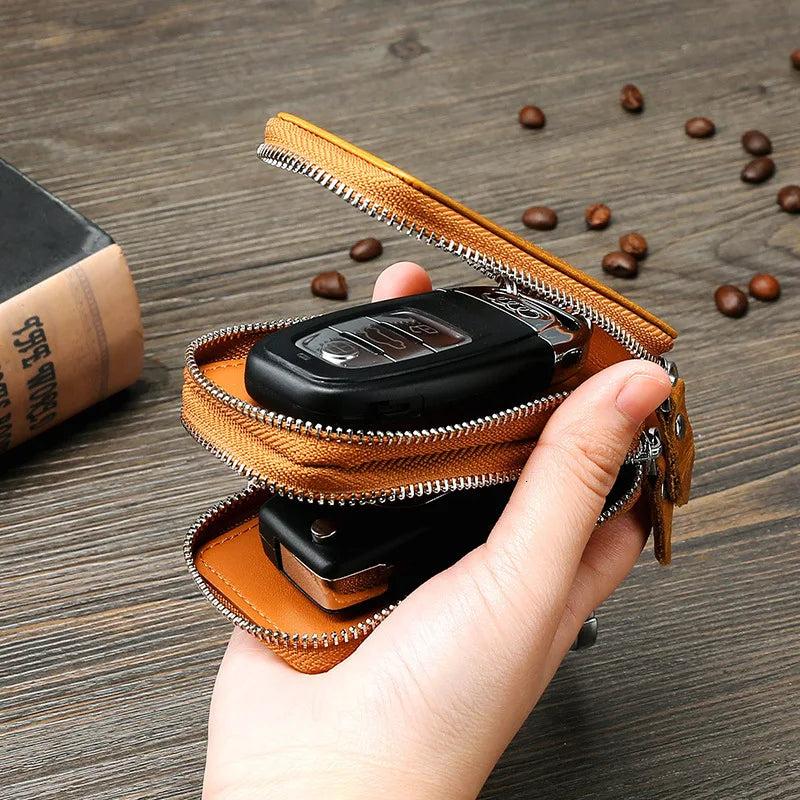 This genuine leather key wallet features a zipper closure and is perfect for storing car keys, house keys, and other small items. It is a practical and stylish accessory for both men and women.