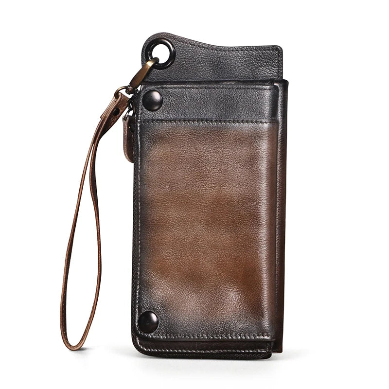 Stay organized in style with this retro-inspired leather wallet. Features embossed design, chain, zipper pocket, and compartments for all your essentials. Perfect for travel or everyday use.