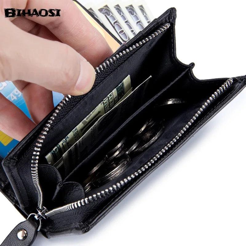 Stay stylish and secure with this RFID antimagnetic leather wallet designed for men. It features a short design suitable for business use and includes a wristlet for added convenience.