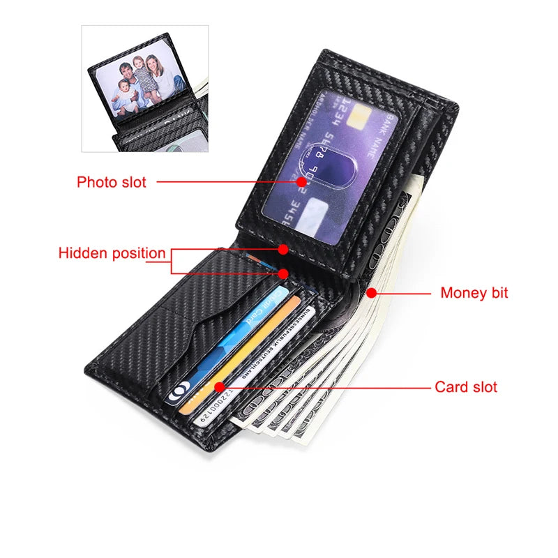 Stay organized and secure with this slim and stylish mini bifold wallet. Made of high-quality carbon fiber leather, this wallet is equipped with RFID protection to keep your information safe.