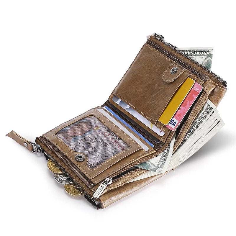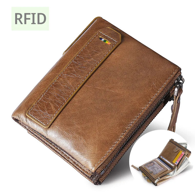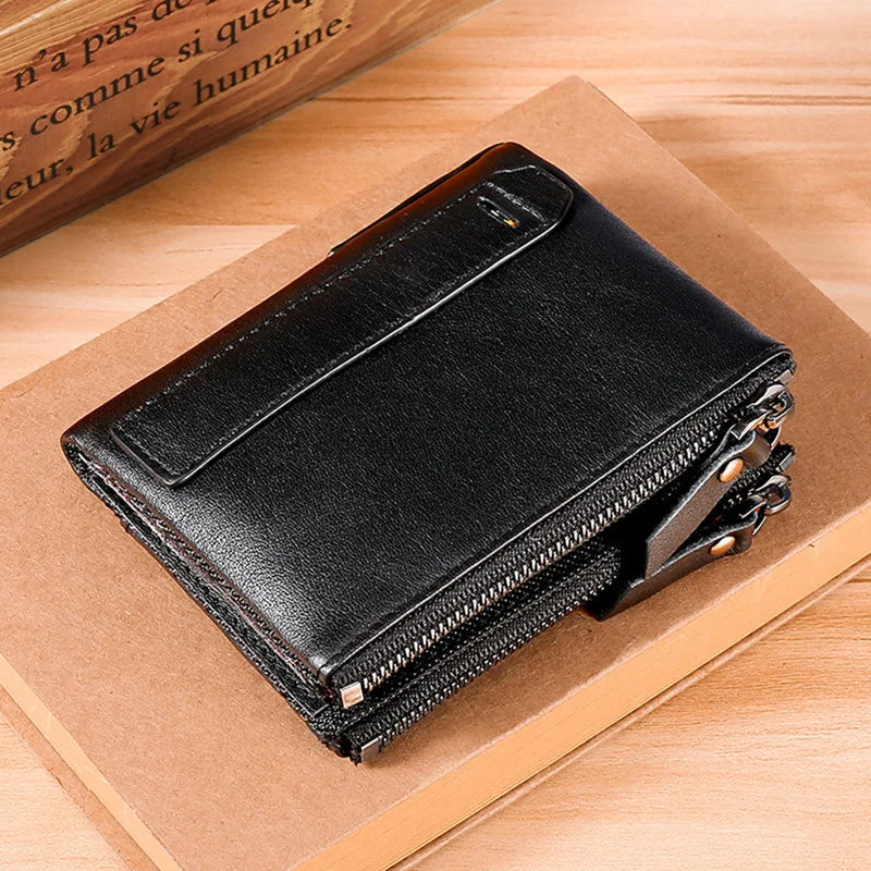 RFID Leather Wallet for Men Double Zipper Vertical Pocket