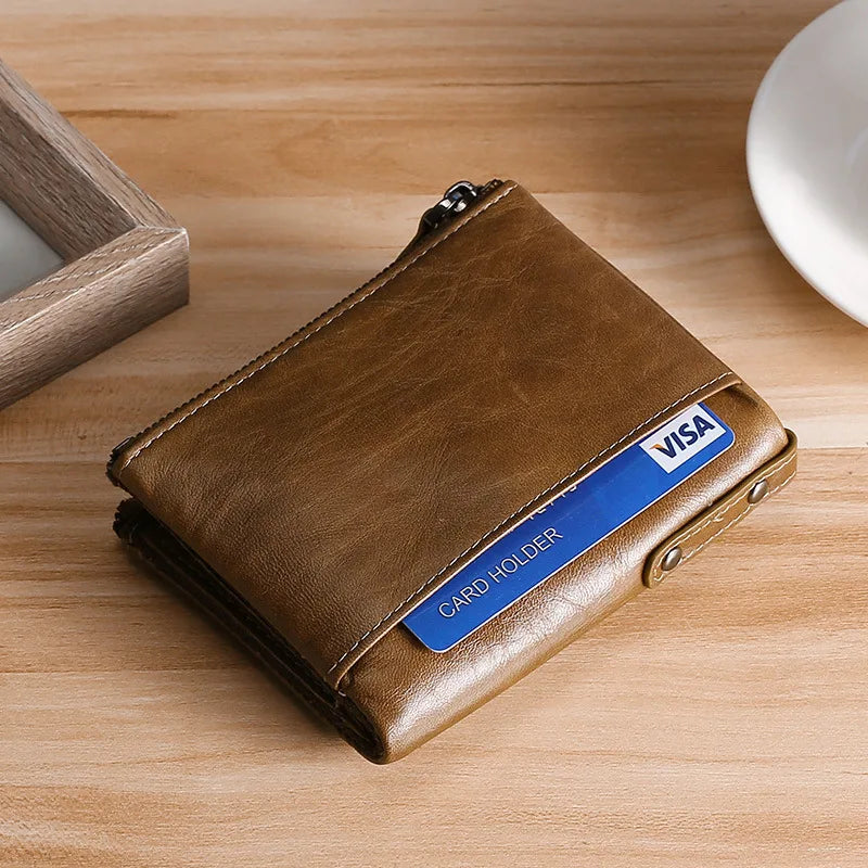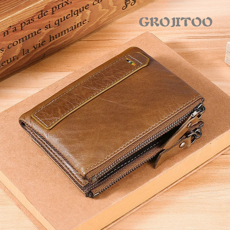 Stay secure and stylish with this RFID wallet designed for men. Crafted from genuine leather, this short wallet features double zippers and a vertical pocket. Perfect for keeping your essentials organized and protected.