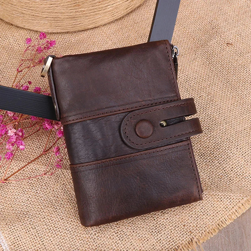 Stay organized and secure with this stylish retro men's wallet made from crazy horse leather. Features multiple card slots, double zipper closure, and RFID protection.