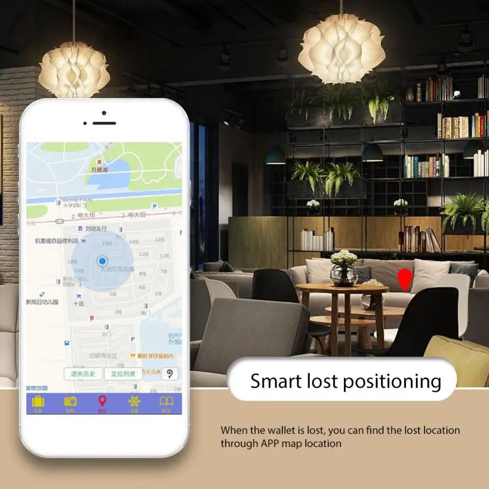 This smart men's wallet features sequined design, faux leather material, Bluetooth connectivity, and anti-lost GPS tracking. It's a stylish and functional accessory for men.