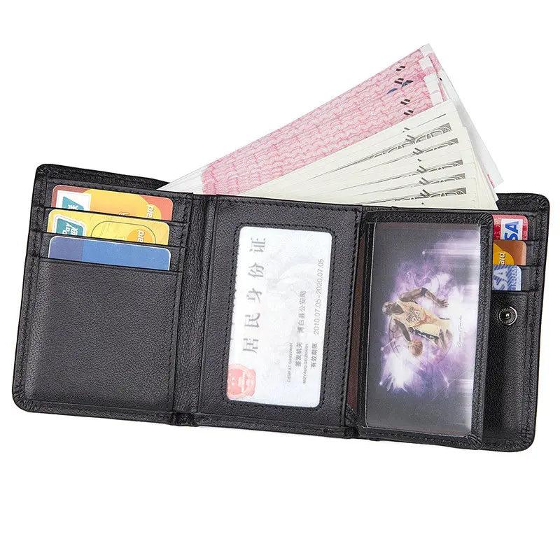 This high-quality men's wallet is made of genuine leather and features a trifold design with a secure hasp closure.