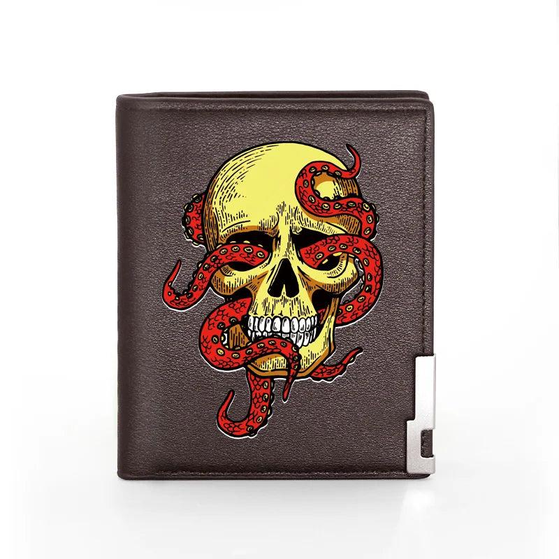 This men's wallet features a unique squid skull cover design with printing. It offers a slim profile and holds credit cards, IDs, and money securely.