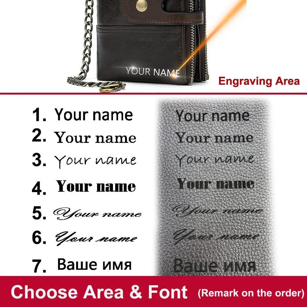 This high-quality men's wallet is made from 100% leather, featuring an anti-theft chain and zipper closure. Personalize it with name engraving for a unique touch.