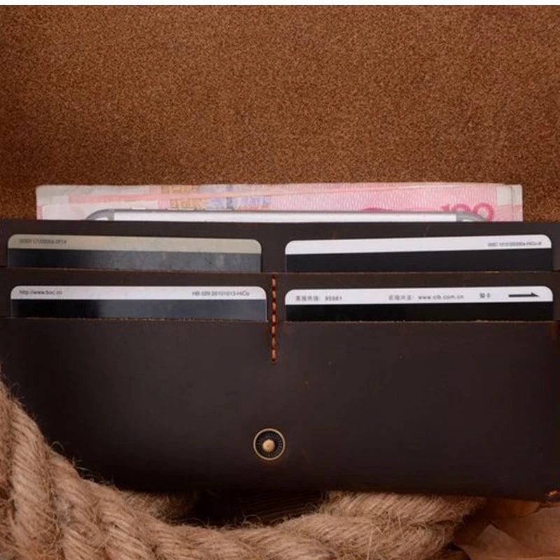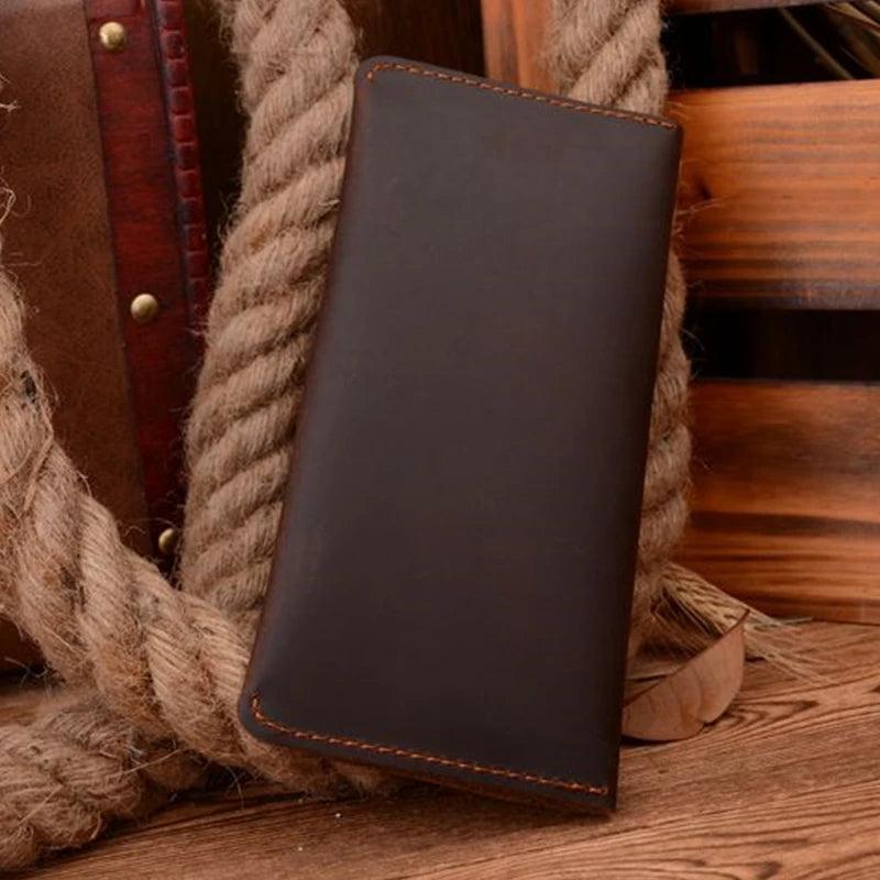 This wallet is made of high-quality first layer leather and features a classic vintage design. It has a long shape with multiple card slots and a zipper pocket.
